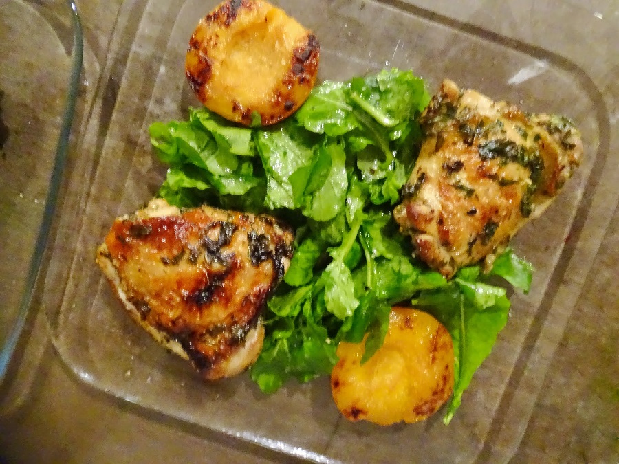 Serve the chicken thighs with a side of pickled peaches and a green salad for a light and refreshing meal.